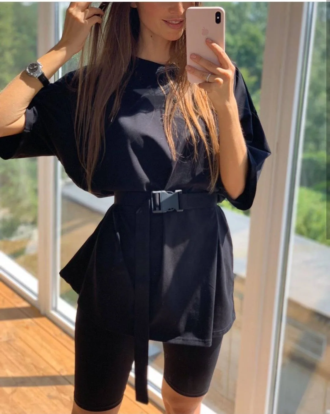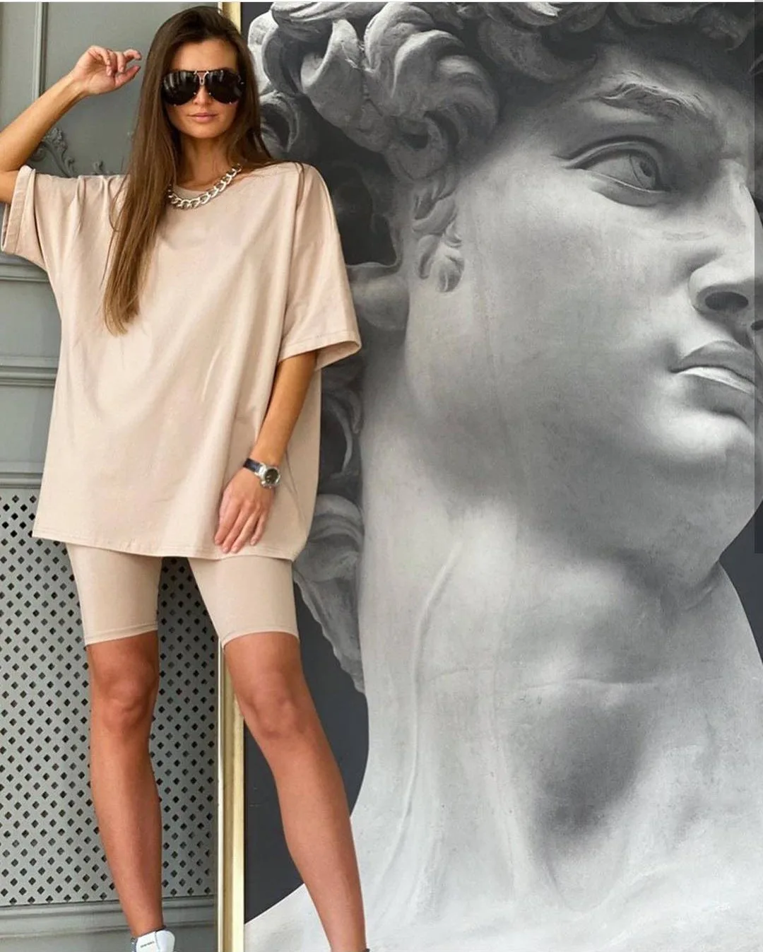 . (51% Off) 買取 夏 2020 女性oネックルーズ半袖トップシャツとバイカーパンツカジュアルツーピースホワイト衣装カーキ色のスーツ オンライン 価格.