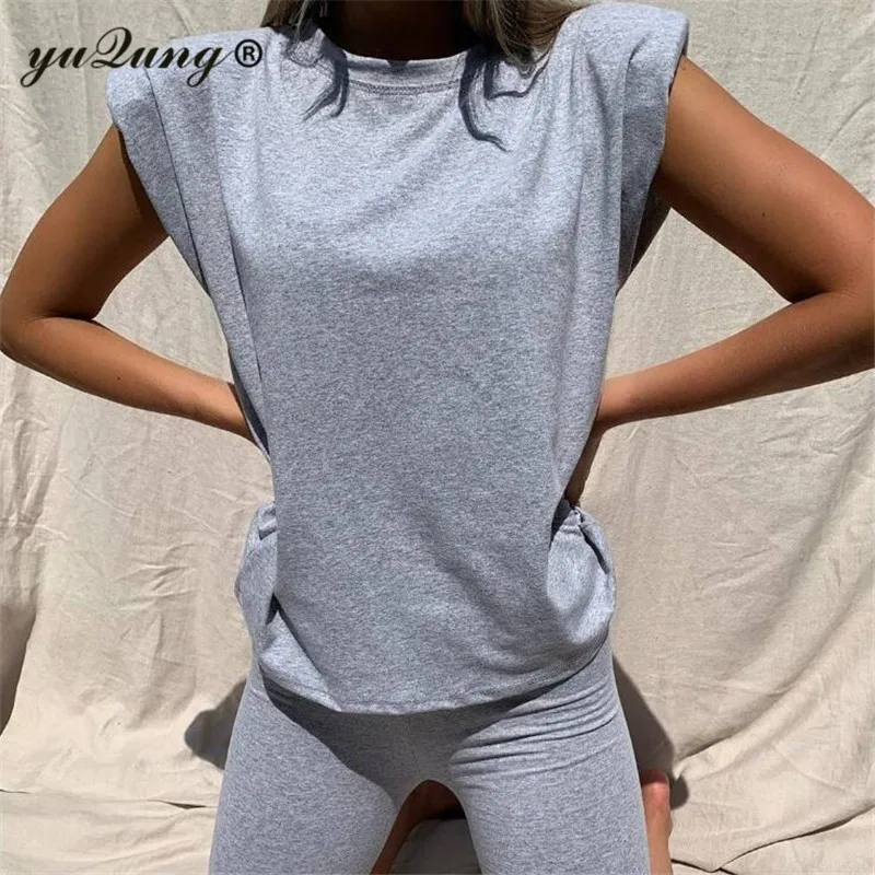 . (50% Off) 買取 Yuqung夏カジュアルoネックカーキノースリーブツーピースセット入りショルダールーズトップシャツとショートパンツ 2 ピース女性セット服 オンライン 価格.