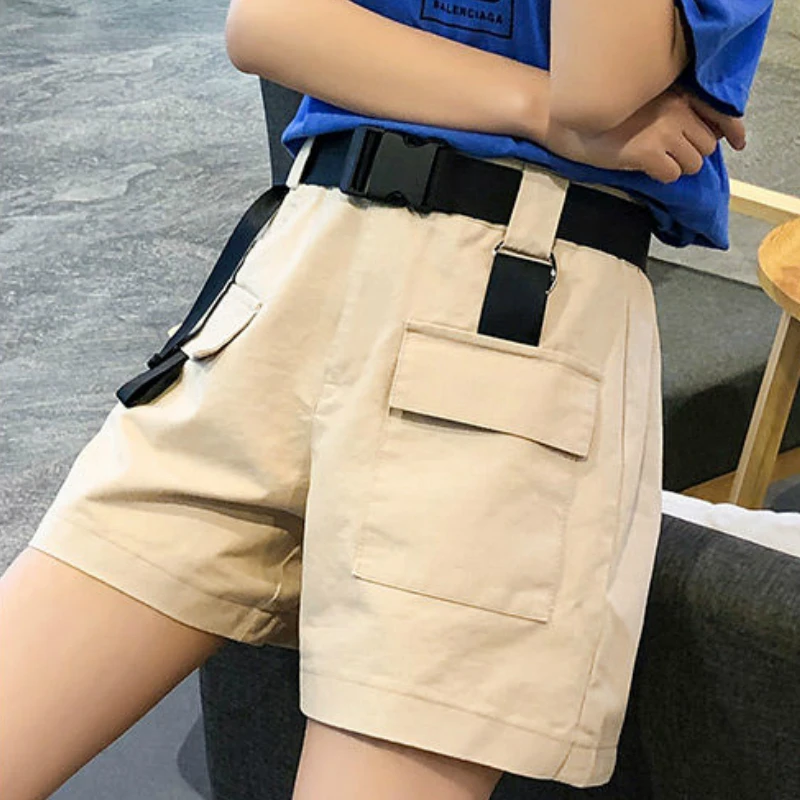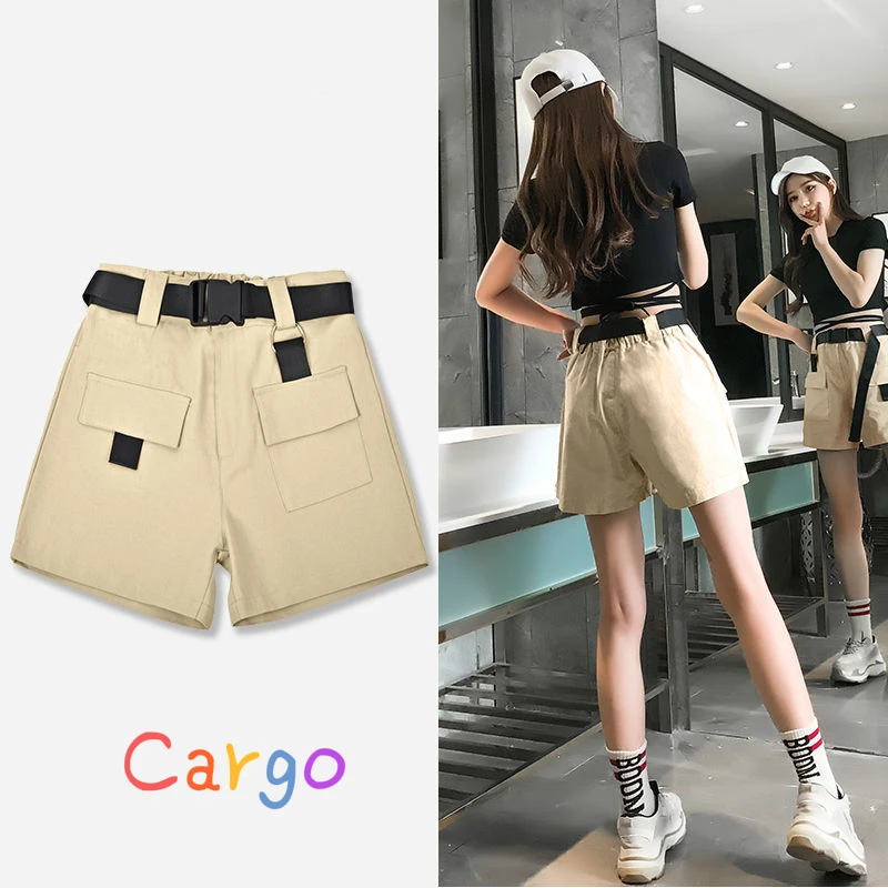 . (5% Off) 安い ショーツレディース夏 2020 Bf ルーズミッドウエスト貨物カーキカジュアルベルト固体ポケットクールストリートファッションシックなノベルティ女性ホットな新 通販 価格.