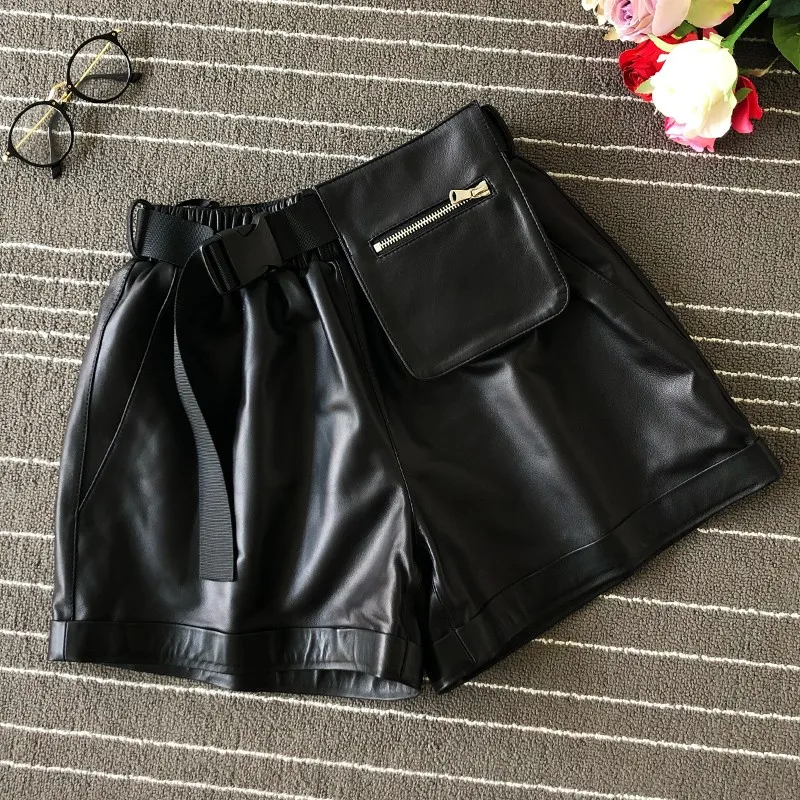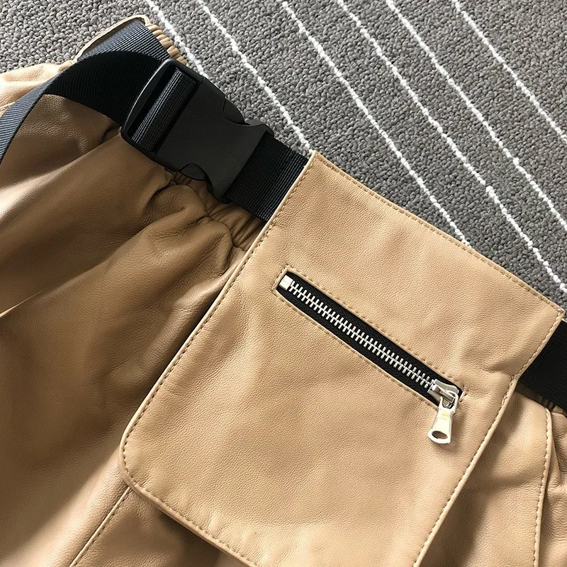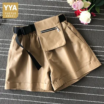 Special Offer ハイストリート女性のファッションのウエストバッグカーゴショーツカーキワイド脚ショートパンツカジュアルルーズフィットシープスキン本革 Discount 37% Today!