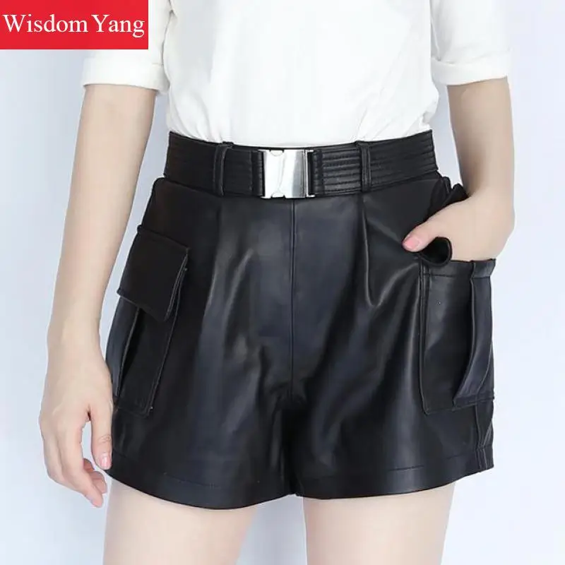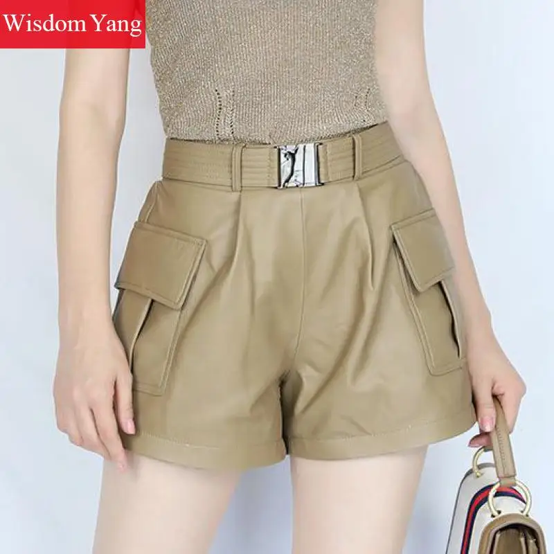 Special Offer 秋の女性ワイド脚シープスキン本革ルースハイウエスト黒カーキミニ女性フレアズボン服 Discount 40% Today!